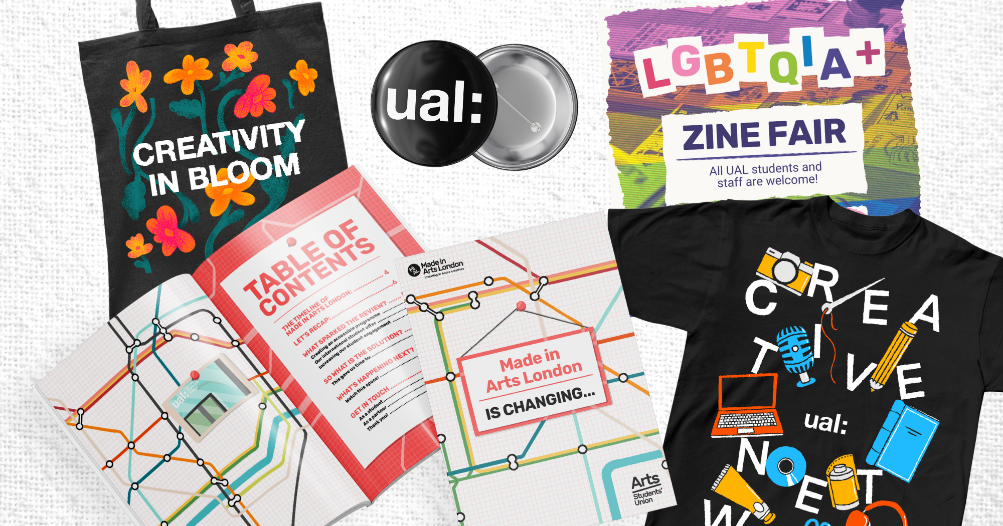 Key projects included; a book design of an online report for Made in Arts London, where I developed the SU brand into a pleasing sub-brand – promotion for an LGBTQIA+ zine fair – and the new UAL graduation merchandise design.
